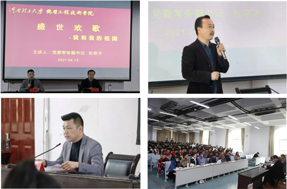 杜宗才以“盛世欢歌—我和我的祖国”为题,从最美爱情、最美励志、最美祖国三个方面,给大家带来了一场别开生面的党史学习教育动员。指出学习党史的目的就是不忘初心、坚守初心,当代大学生要将个人志向与国家志向保持一致,要永远有追求、有目标,要在奋斗的道路上始终初心如一,行稳致远。