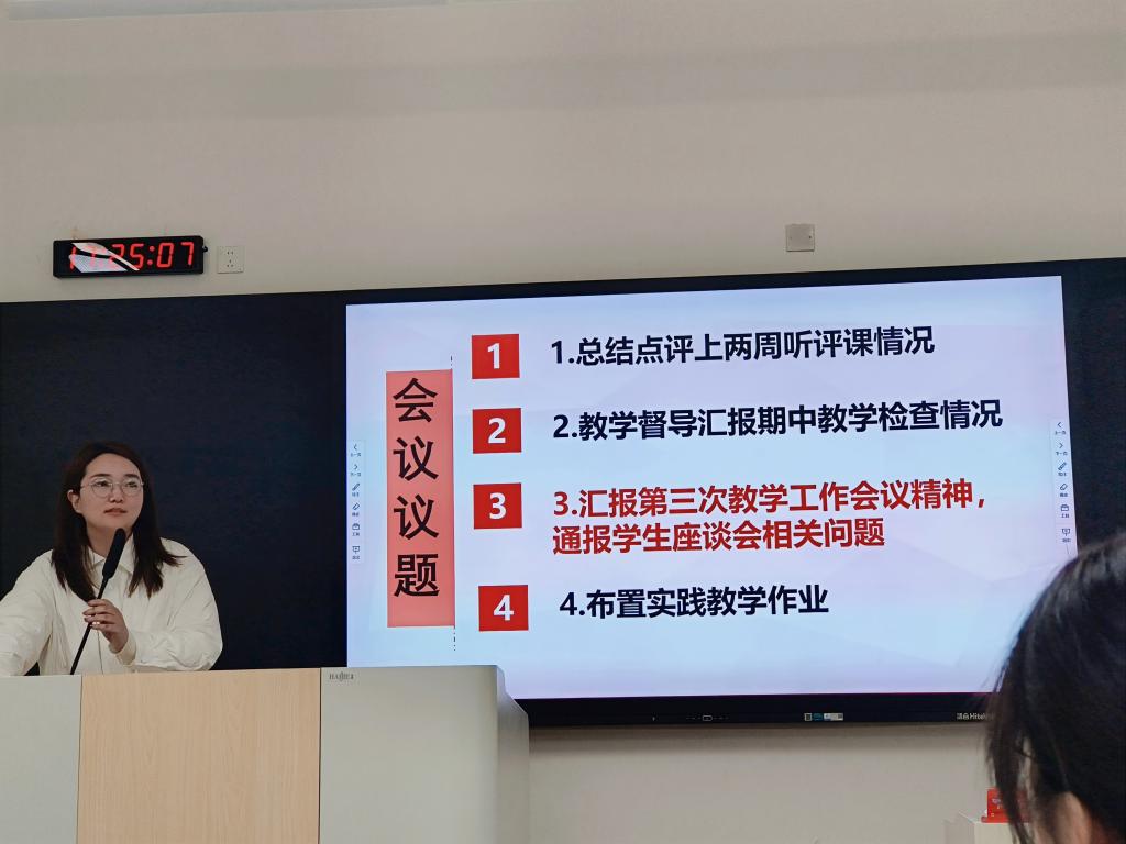 负责人传达第三次教学工作会议精神,通报学生座谈会相关问题。教学秘书汇报了本学期的教学情况并就下学期排课有关工作进行了安排。教研室主任对期末思政课实践教学作业进行了安排和部署。负责人对本次教研会议进行了总结,一是马院全体教师要凝聚共识,发挥教学团队协作优势,贯彻立德树人根本任务,全面提升思政课教学质量,上好有温度的思政课。二是马院教师政治要强、自律要严、情怀要深。目前学校正处于本科申建工作关键阶段,每位教师要担当尽责、加压奋进、主动作为,做好本科申建的教学准备工作,为推进KissJAV