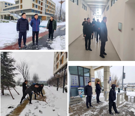 副院长法冠喆、筹建处新校区建设部副主任薛保阳到学校西门查看车辆出入和除雪情况,现场调度专用铲车清除路面积雪,指挥并参与除雪工作。