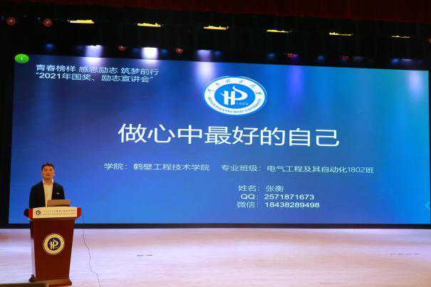 护理2101班孟瑞博、电气2101班李永光作为新生代表发言,他们以国家奖学金、励志奖学金获得者为榜样,努力钻研的学习精神,积极参加各类比赛、勇于自我挑战的拼搏精神,牢记最初的梦想。
