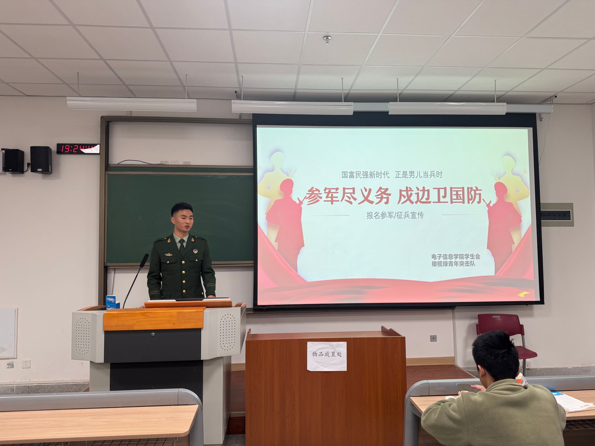 学生工作办公室精心筹备。12月17日晚,邀请橄榄绿突击队的退役士兵们进班级,开展了一场激情澎湃的征兵宣讲会。这些曾在绿色军营中淬炼过的热血青年,满怀豪情地分享了他们的军旅生涯,用亲身经历点燃同学们心中的报国之火,为校园注入了一股磅礴的强军力量。