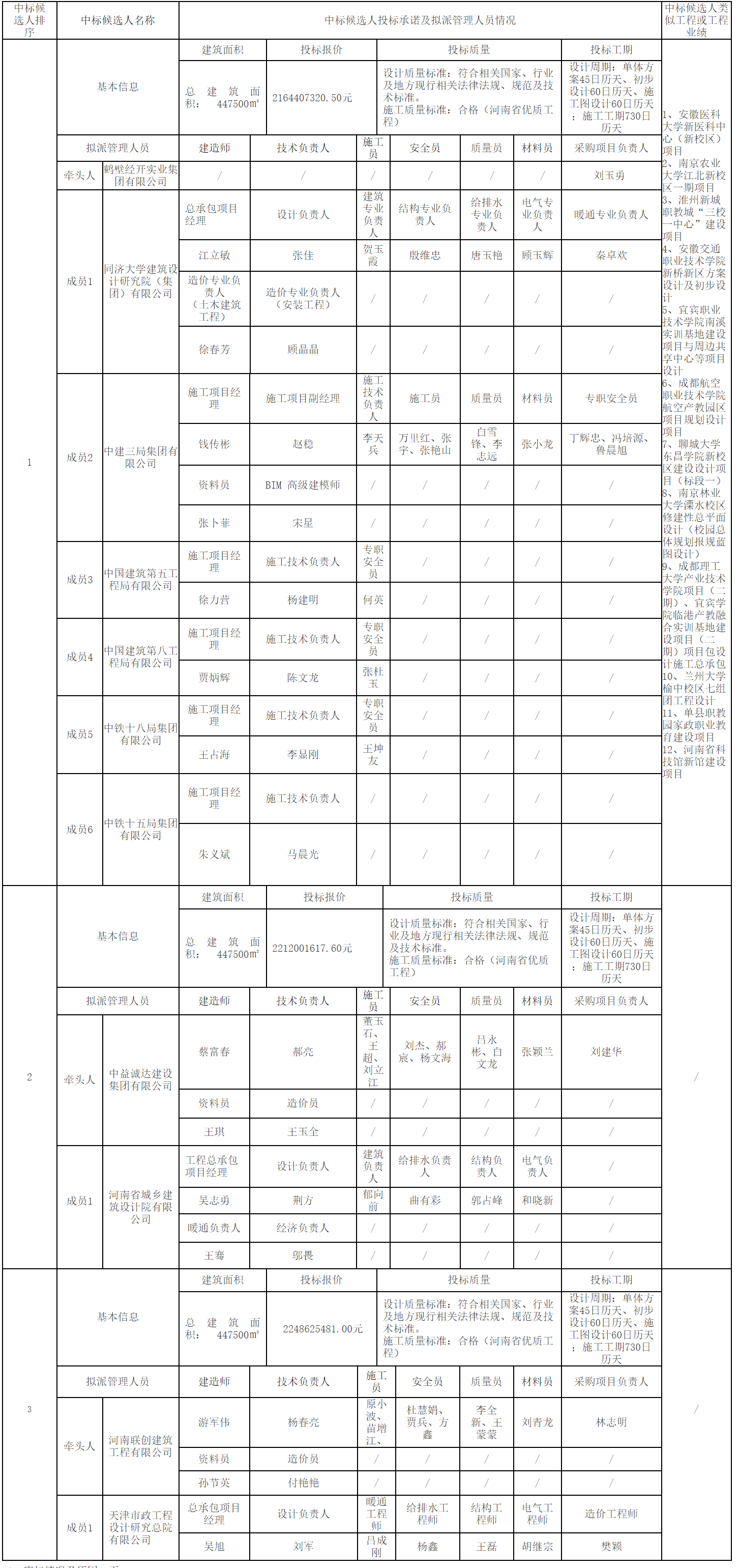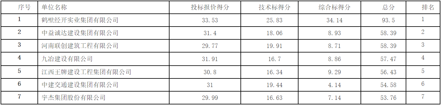 新校区工程总承包项目 ,按照法定程序,于 2022 年 7 月 4 日上午 09 时 30 分,在鹤壁市公共资源交易中心三楼第 1 远程开标室公开开标,评标工作在鹤壁市公共资源交易中心三楼第 1 评标室进行,评标委员会依据招标文件规定的评标标准和方法进行了评审,经评审,评标委员会推荐中标候选人如下: